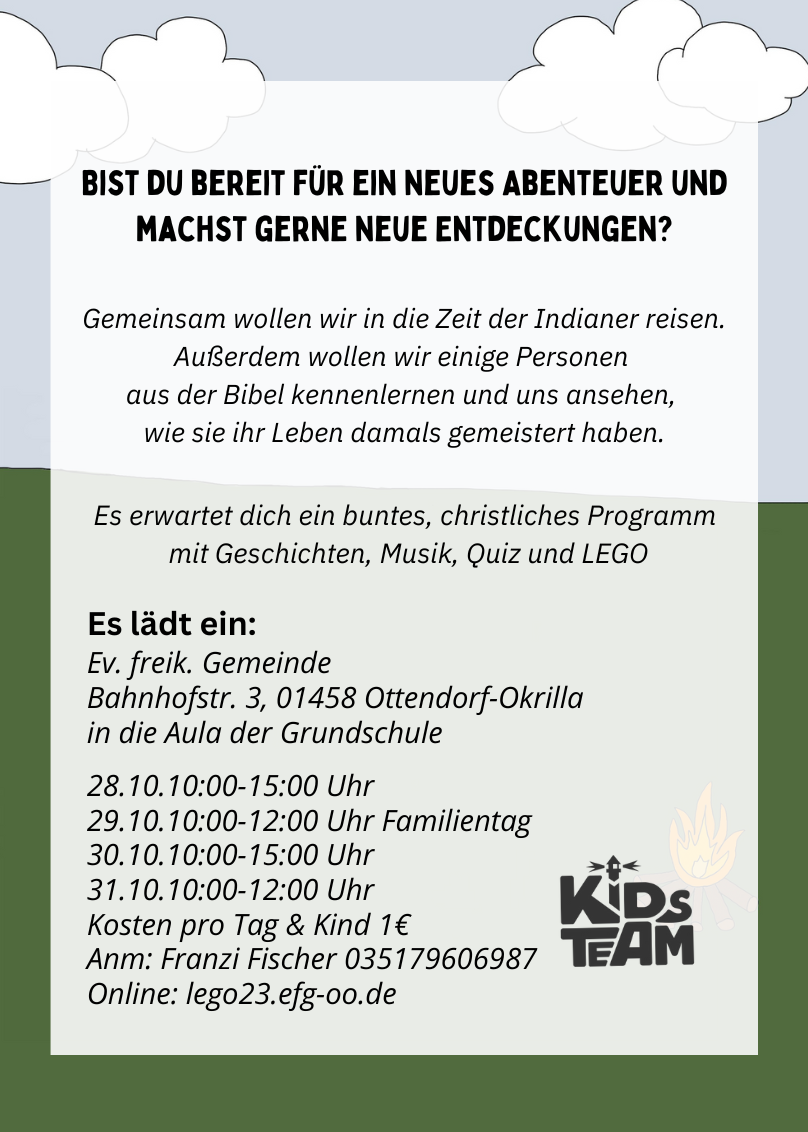 Sie können sich unter 0351/79606987 (Fam. Fischer) oder unter legotage@efg-oo.de an uns wenden.